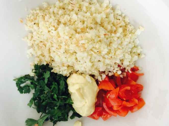 Gerösteten Blumenkohl etwas abkühlen lassen und im Anschluss mit Mayo, Zitronensaft, Tomaten und Petersilie vermengen.