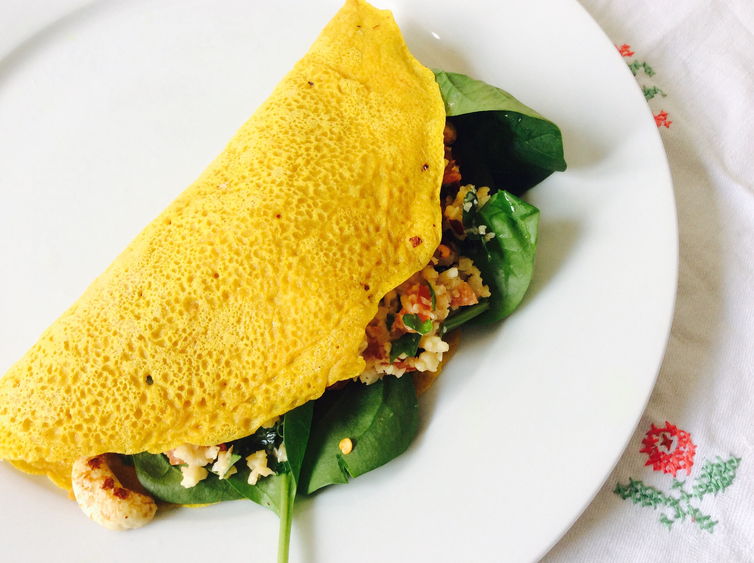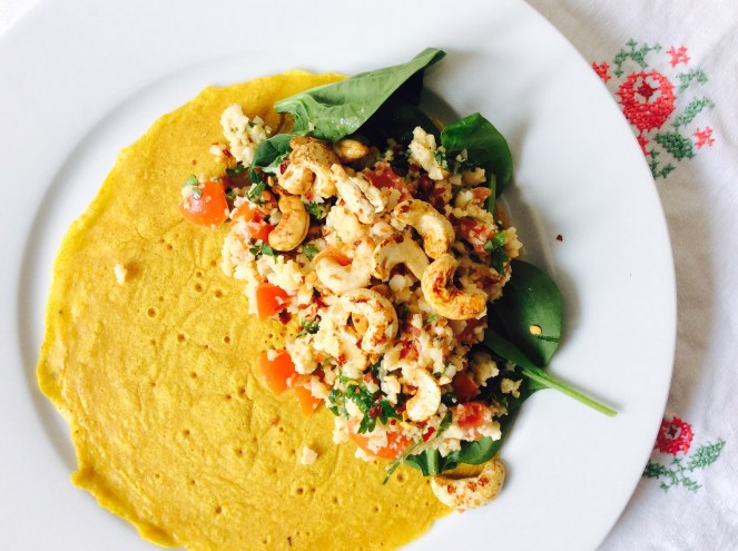 Nun machst Du die Galette- easy, wie ein Pfannkuchen- auf einen Teller, mit Babyspinat belegen, Blumenkohlsalat drauf, Cashews on top, zuklappen, Mund auf und rein damit.