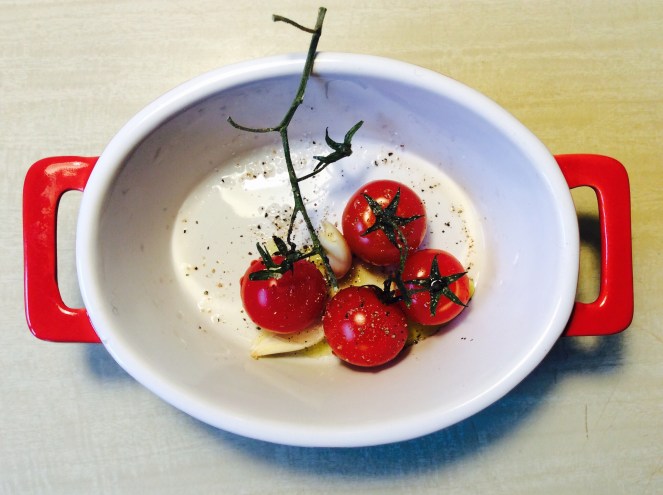 In einer kleinen ofenfesten Form Tomätchen platzieren, würzen und mit Olivenöl beträufeln. Knoblauch schälen und ebenfalls in die Form geben. Bei 250 Grad ca. 20 Minuten im Ofen schmoren.
