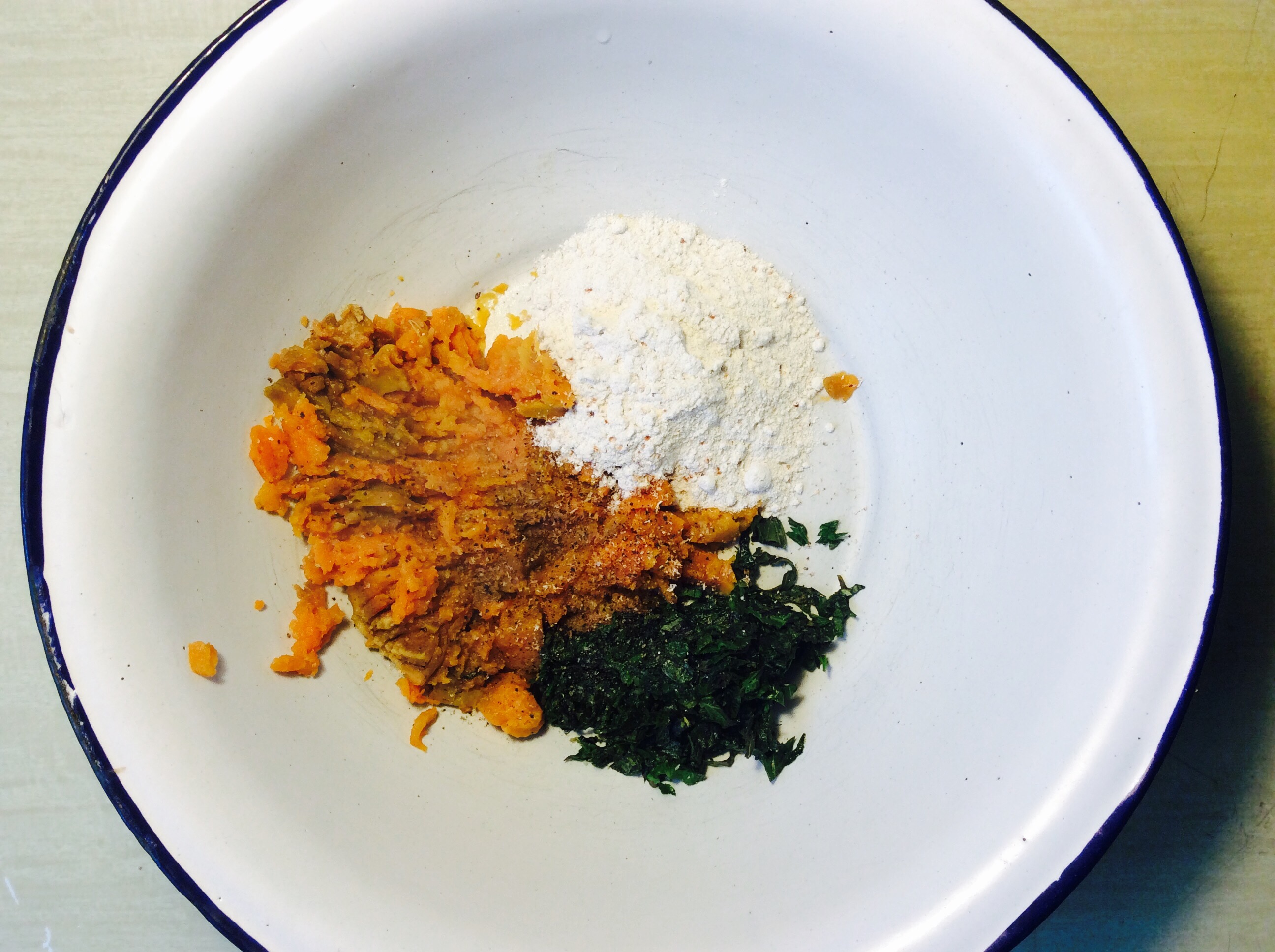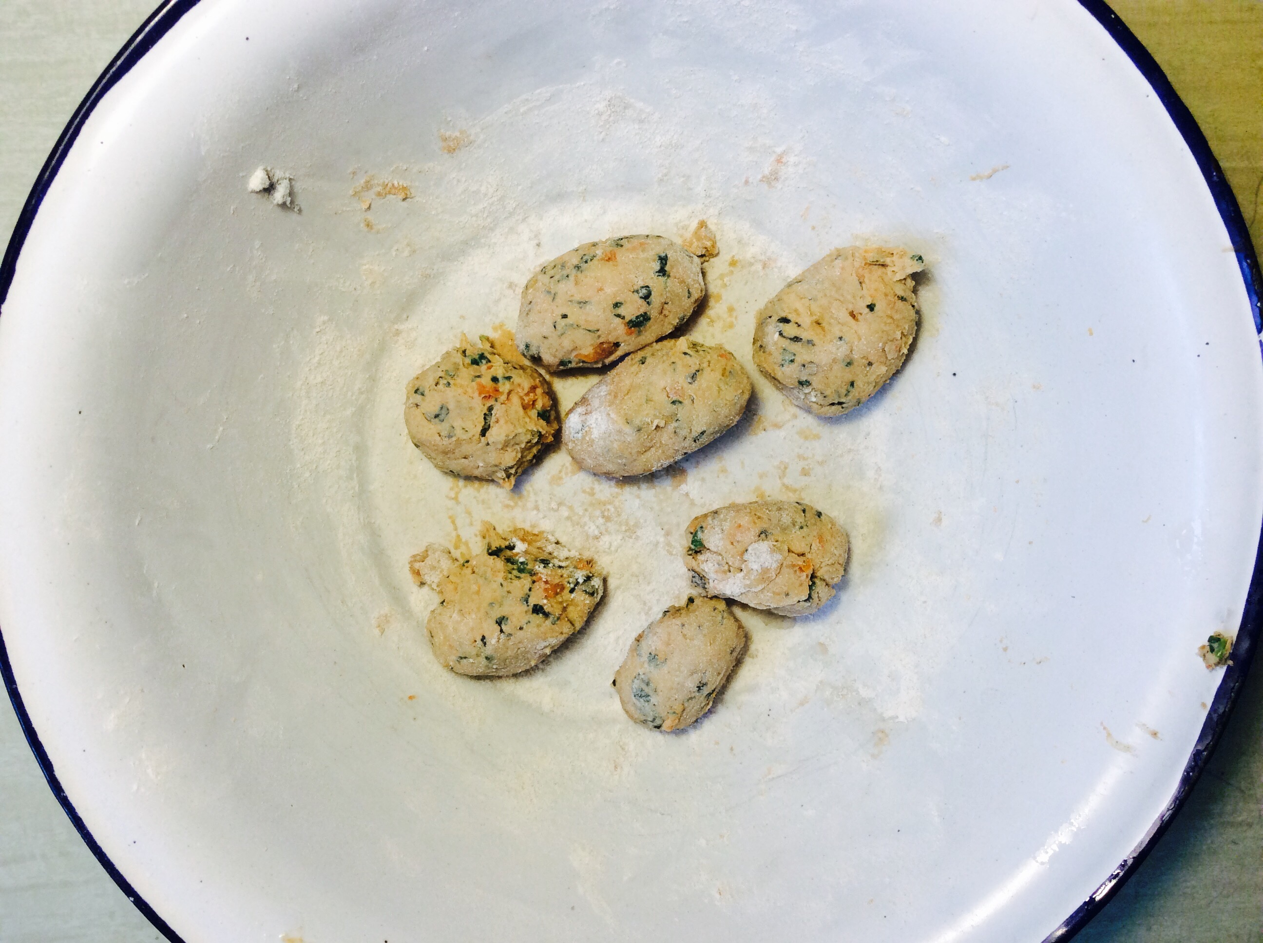 Süsskartoffel schälen, vierteln und kochen. Derweil die Wildkräuter in etwas Olivenöl anbraten. Wenn die Süsskartoffelstücke weich gekocht sind, Wasser abgießen, Kartoffel mit Gabel zerdrücken und mit den Wildkräutern und den restlichen Zutaten vermengen und gut kneten. Bei Bedarf mehr Mehl zugeben.