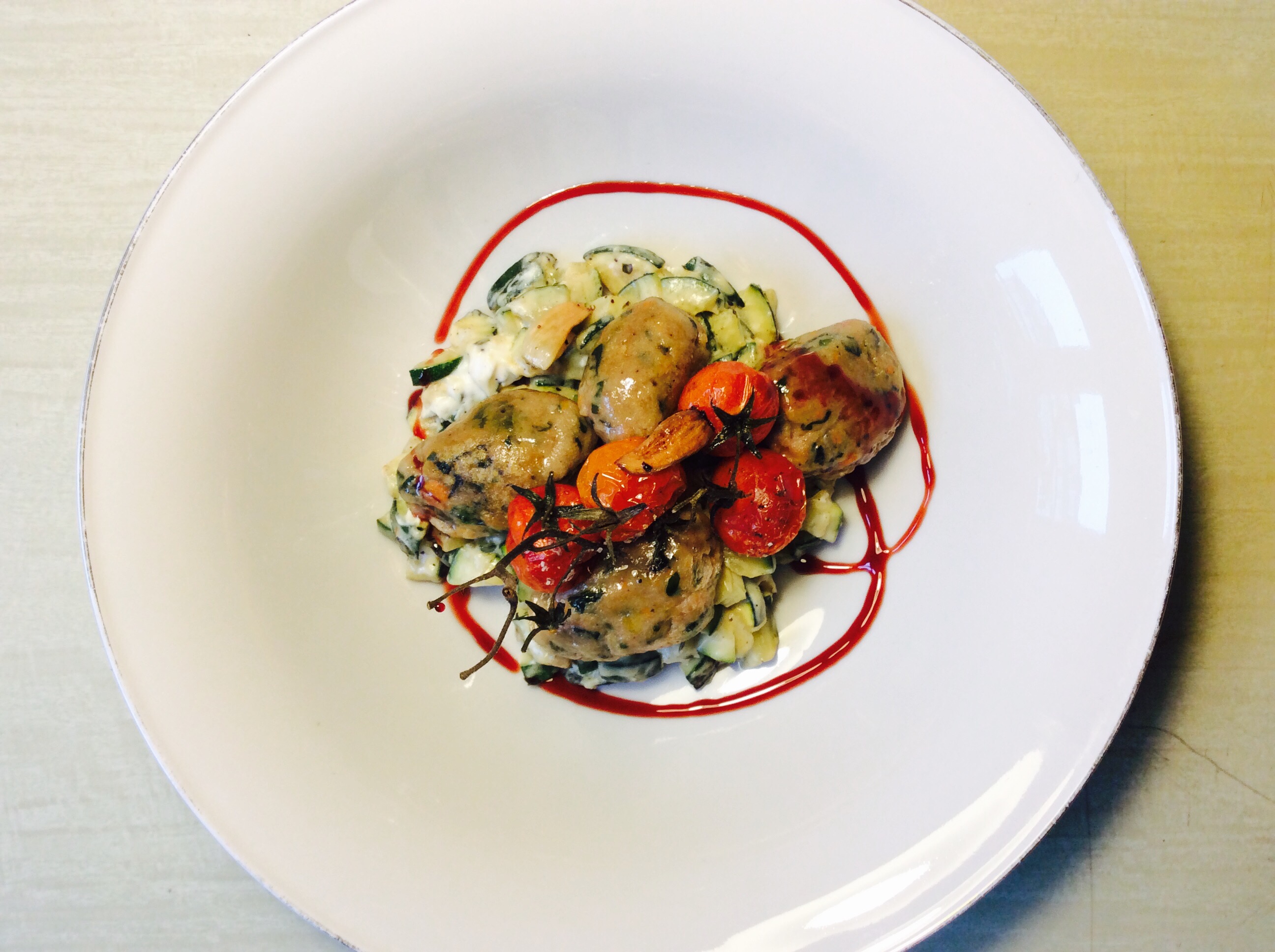 Gemüse auf einem Teller anrichten. Nockerl drauf setzen, mit Ofentomaten verzieren und evtl mit Chilflocken bestreuen und genießen.