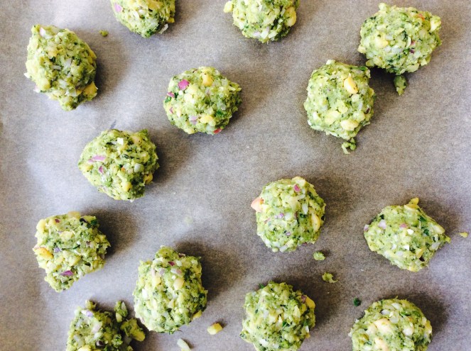 Alle Zutaten in den Mixer und pürieren, nicht zu fein. Kleine Bällchen formen, auf ein Backblech mit Backpapier legen und bei 190 Grad ca. 15-20 Minuten backen.
