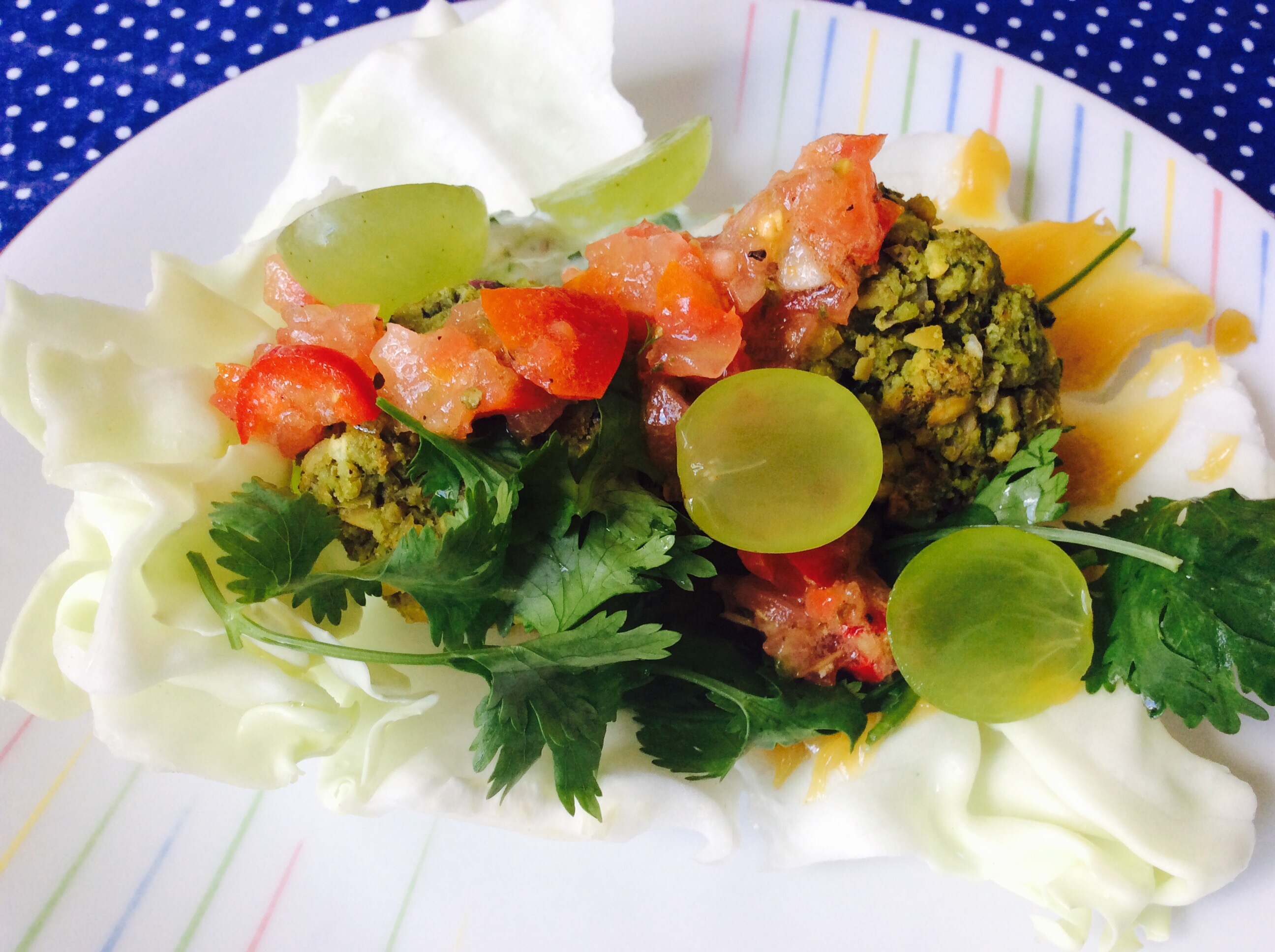 Den Spitzkohl waschen und Blätter vorsichtig lösen, ein paar Weinträubchen halbieren, Dips anrichten, Falafel aus dem Ofen holen, frischen Koriander waschen und grob hacken. Alles auf einem Kohlblatt anrichten, vorsichtig einwickeln und reinbeißen. Soulfood, wohooo!
