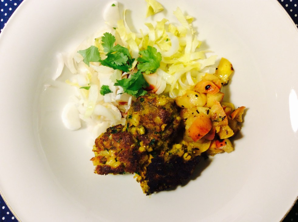 Da ich noch ein paar gekochte Mungbohnen über hatte, habe ich mir dieses Gericht einfallen lassen. Schmeckt unglaublich gut, ist schnell gemacht und obendrein noch sehr gesund. Für zwei Portionen brauchst Du: 1 Tasse gekochte Mungbohnen  1 kleine Zwiebel, klein gehackt frische Petersilie, Koriander oder beides, gehackt Prise Salz 1/2 Teelöffel frisch geriebenen Ingwer 1/2… Weiterlesen Mungbohnenbällchen mit Apfelchutney (glutenfrei und vegan)